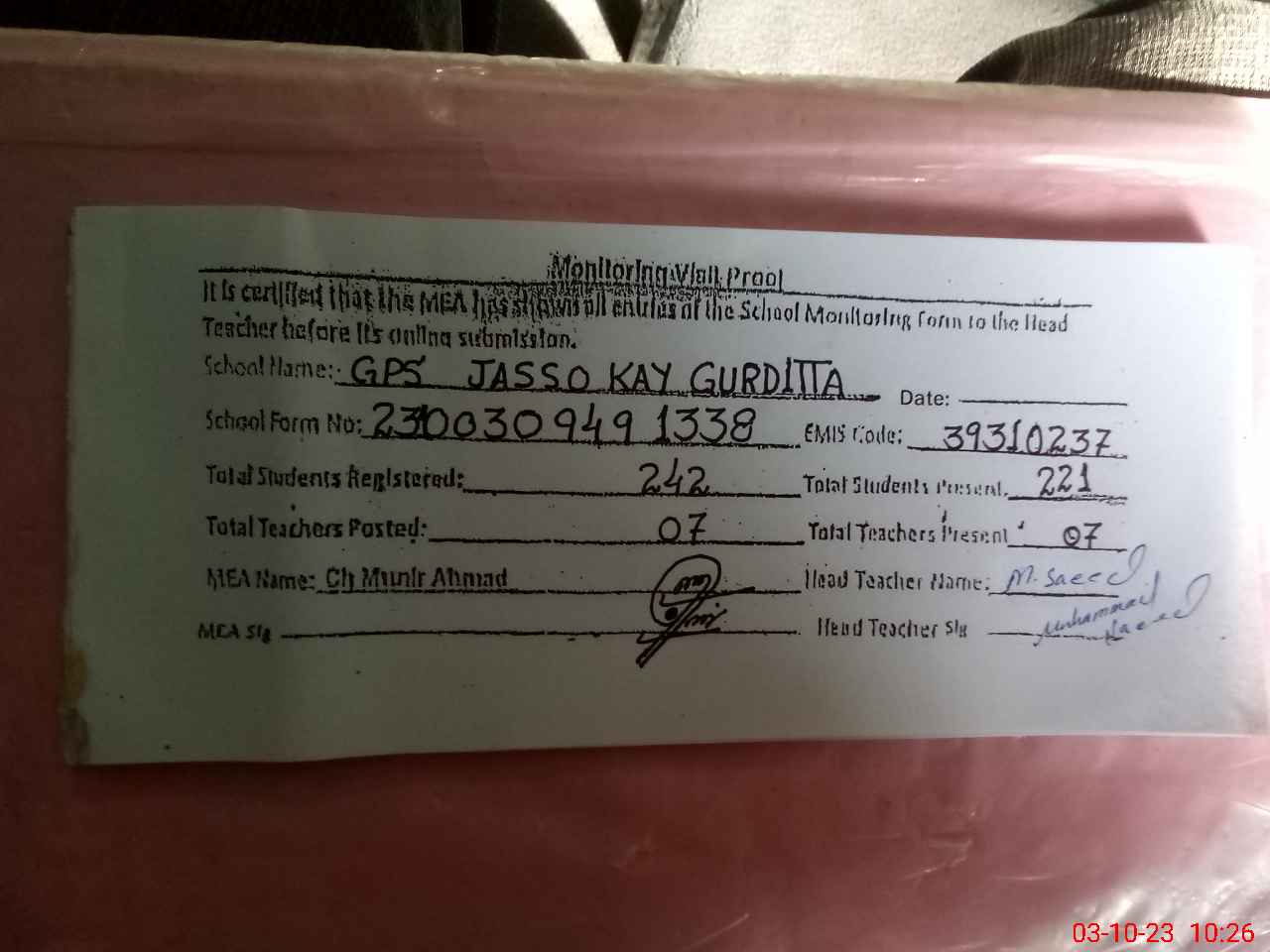 | EMIS Code: 39310237 | Name of School: GPS JASSO KAY GURDITTA | |||
