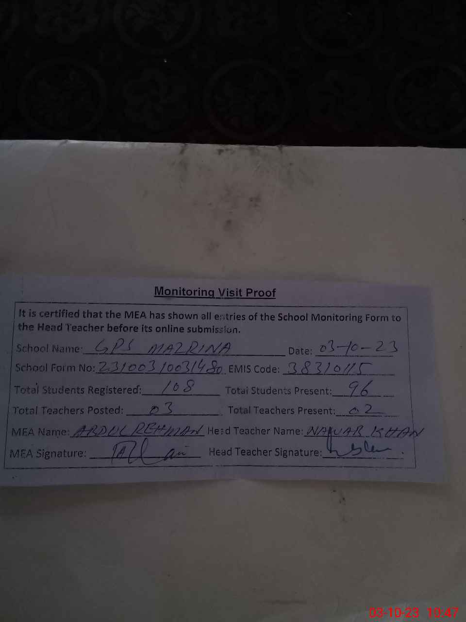 | EMIS Code: 38310115 | Name of School: GPS MAZRINA | |||