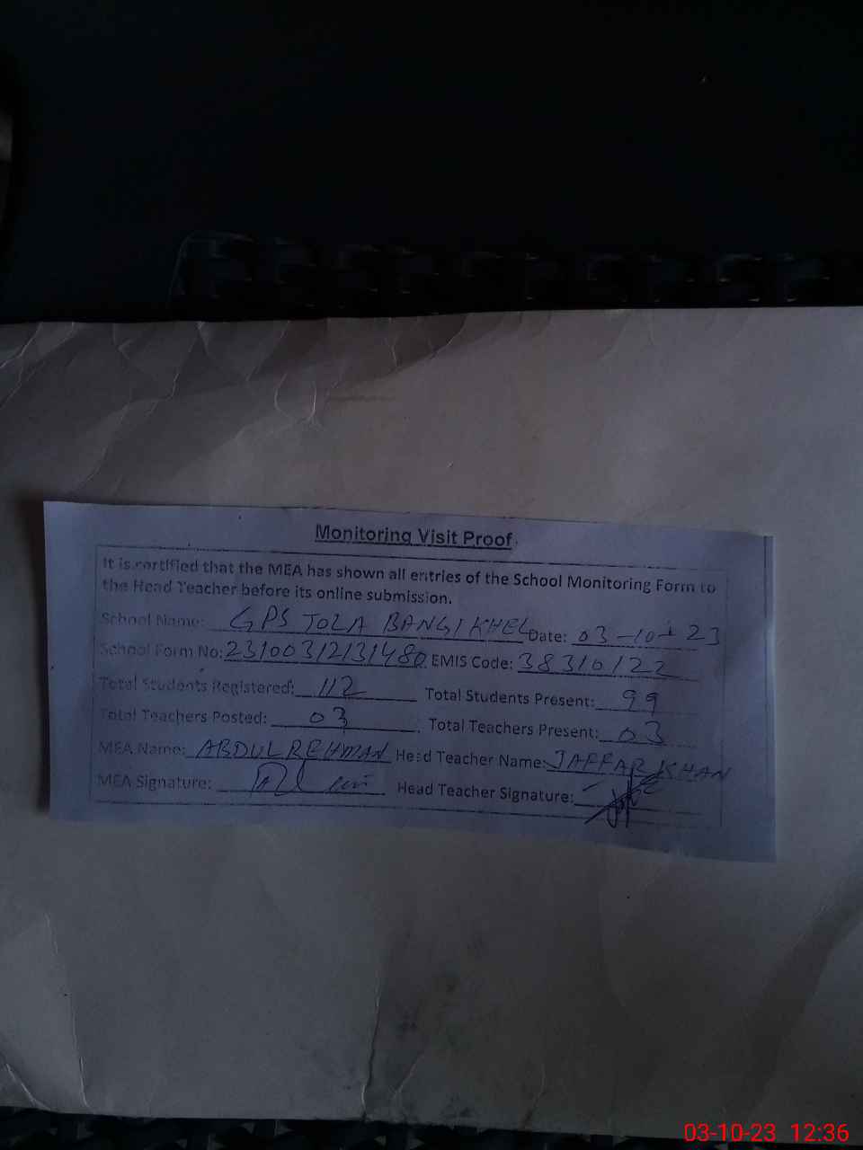| EMIS Code: 38310122 | Name of School: GPS TOLA BANGE KHEL | |||