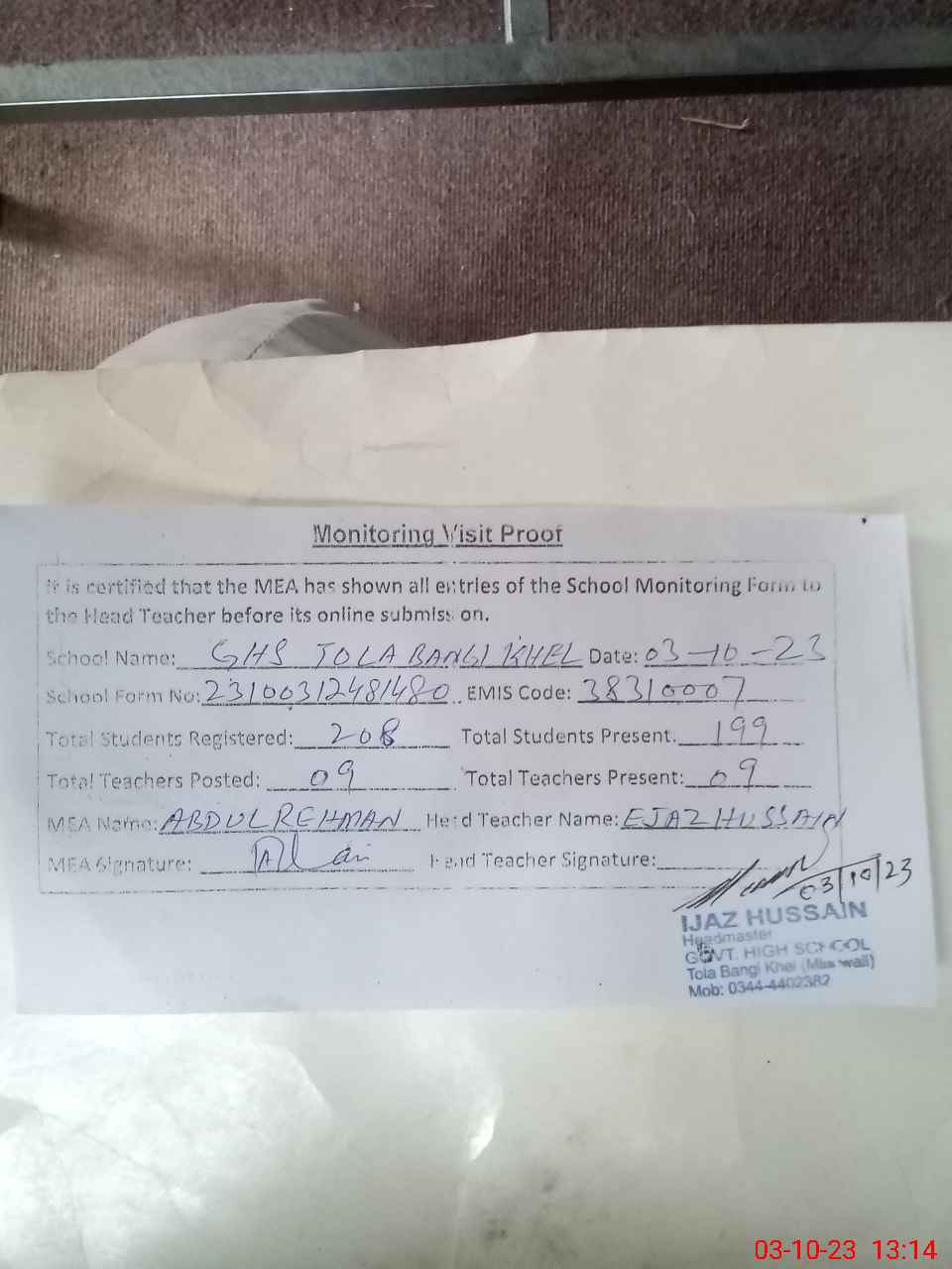 | Attendance Register | Head Teacher | MEA with School | Visit Proof |