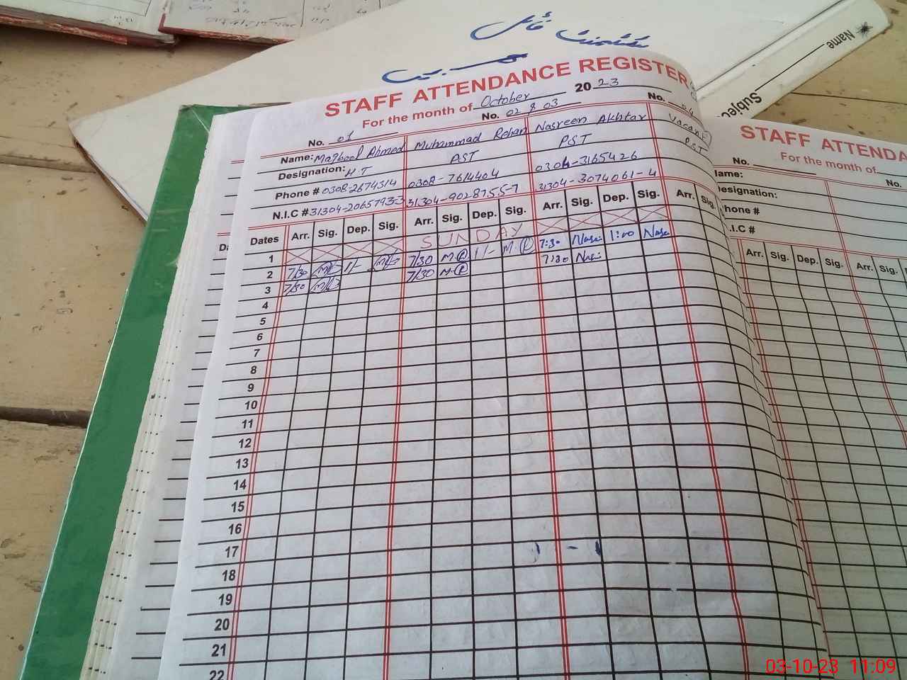 | CNIC | Full Name | Designation | R/C | Absence During Last Calender Month |