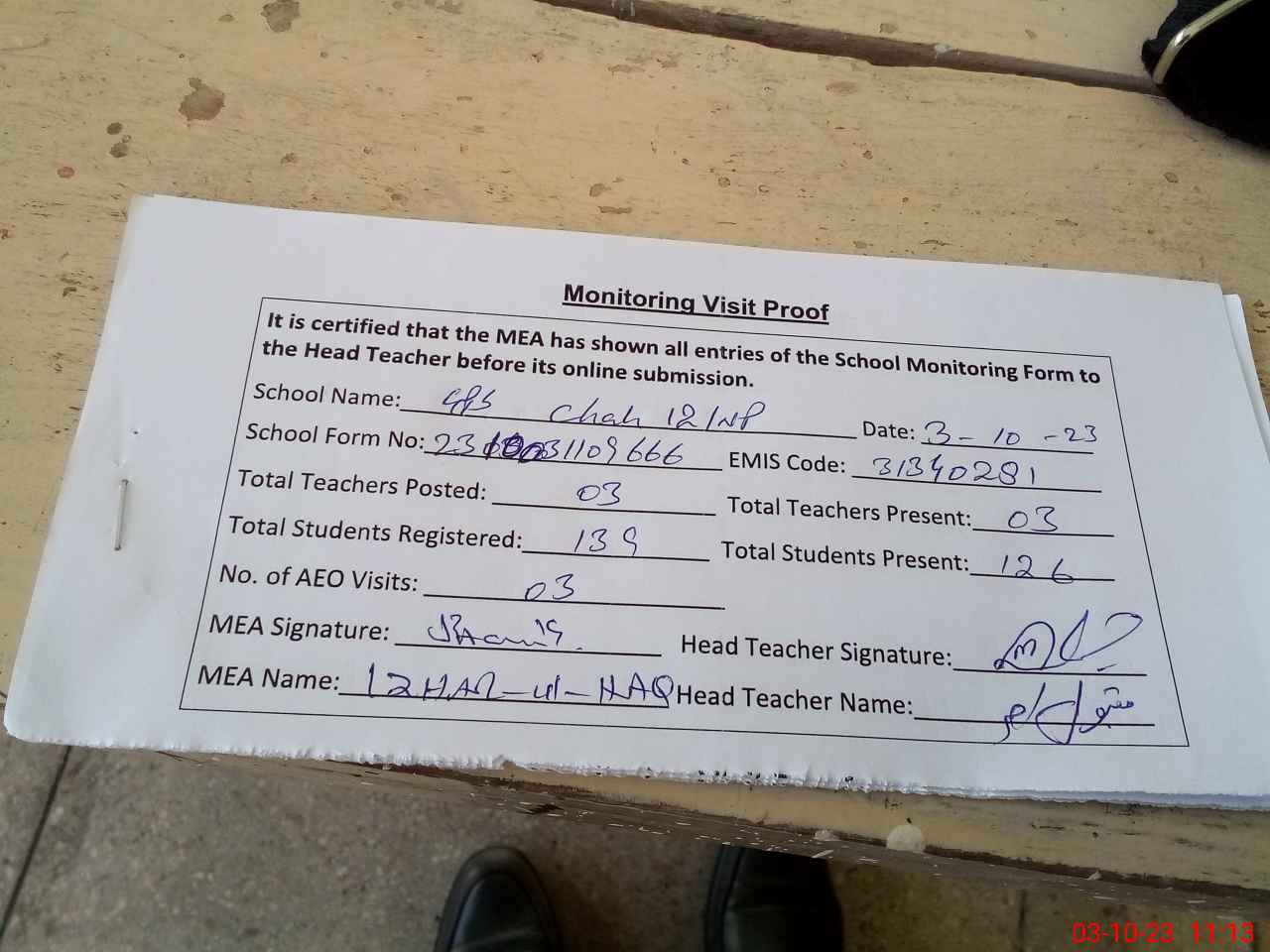 | Attendance Register | Head Teacher | MEA with School | Visit Proof |