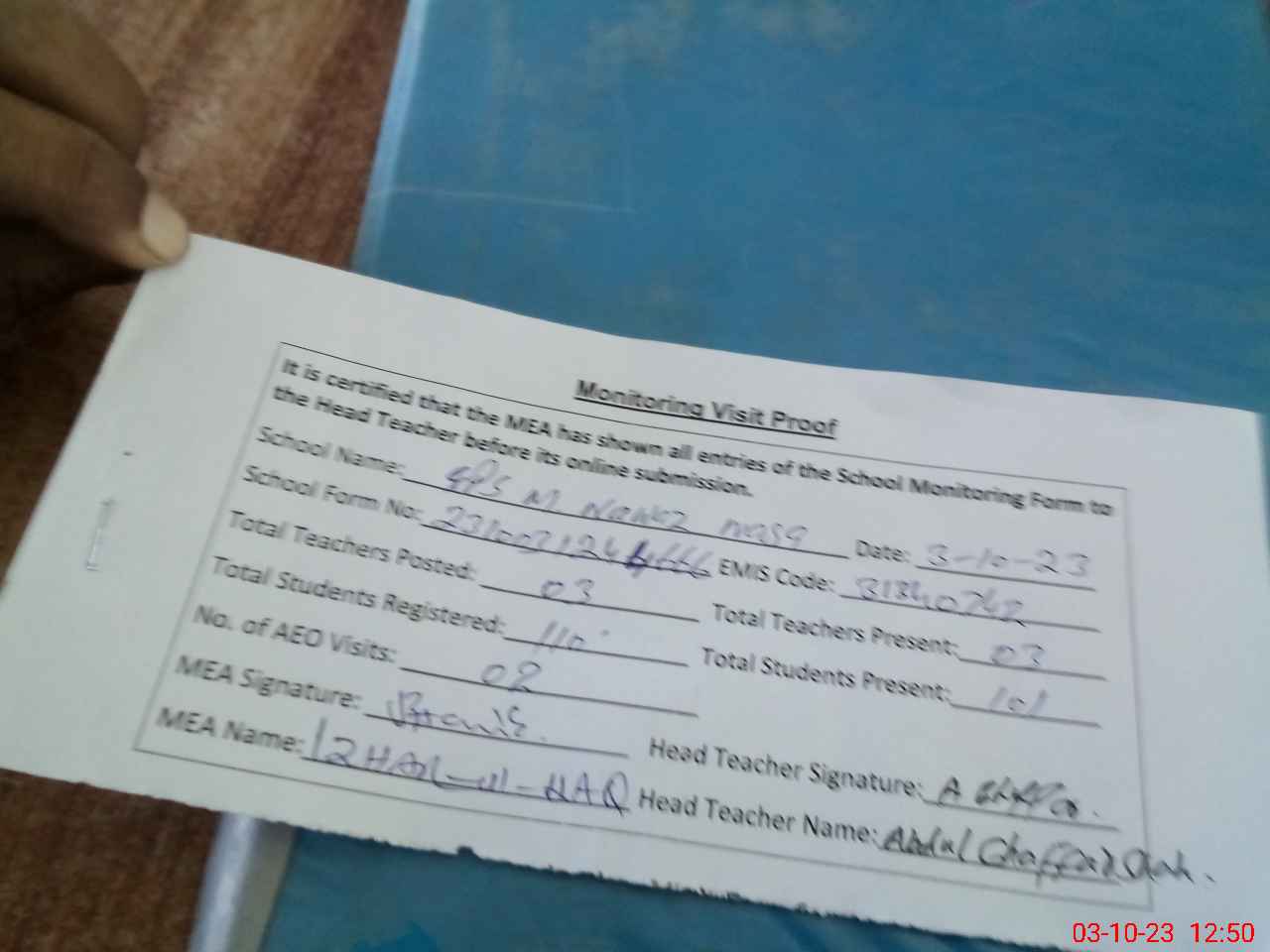 | Attendance Register | Head Teacher | MEA with School | Visit Proof |