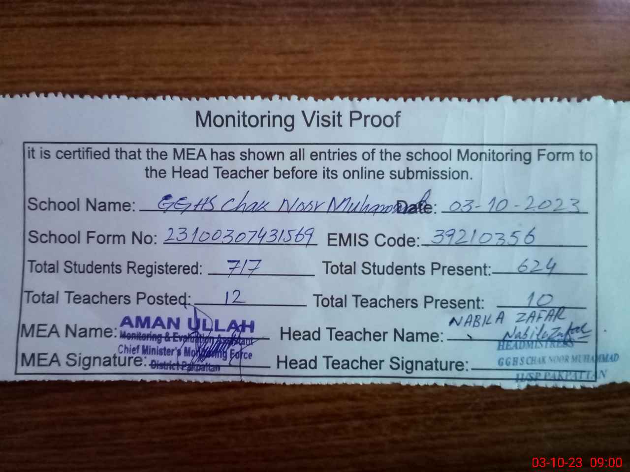 | EMIS Code: 39210356 | Name of School: GGHS CHAK NOOR MUHAMMAD 11/SP | |||