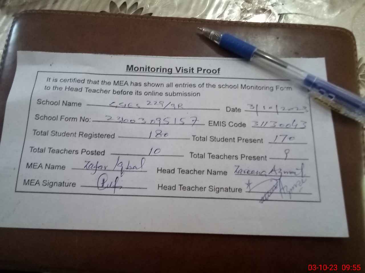 | Monitoring Date: 03-10-2023 | Start Time: 03-10-2023 09:31 AM | End Time: 03-10-2023 09:55 AM | Name of MEA: Za**** Iq**** BN**** | |