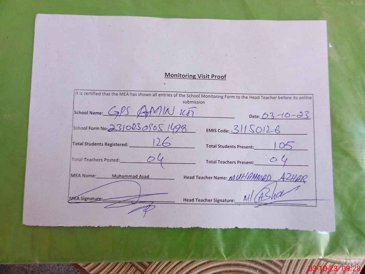 | EMIS Code: 31150126 | Name of School: GPS AMIN KOT | |||