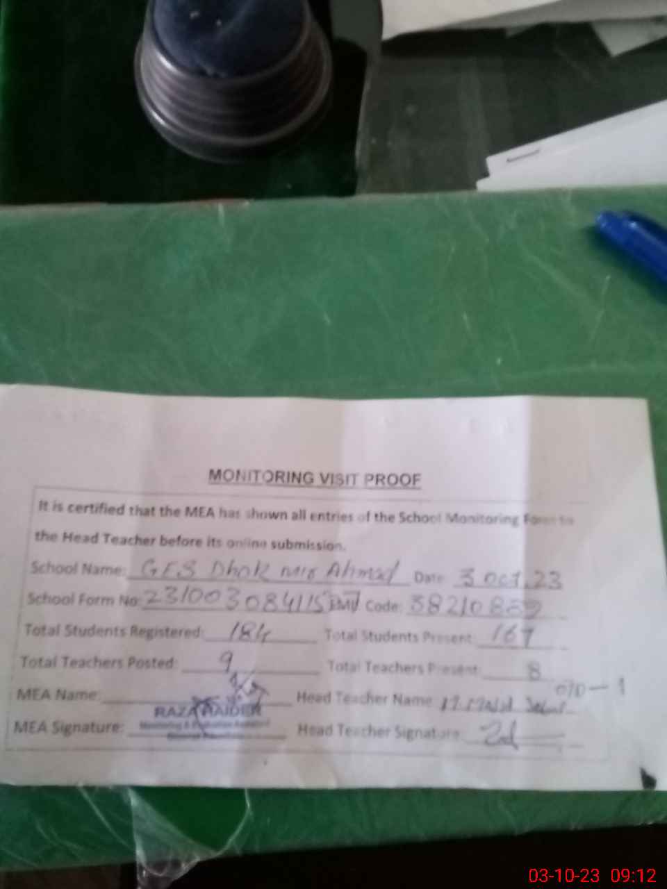 | Attendance Register | Head Teacher | MEA with School | Visit Proof |