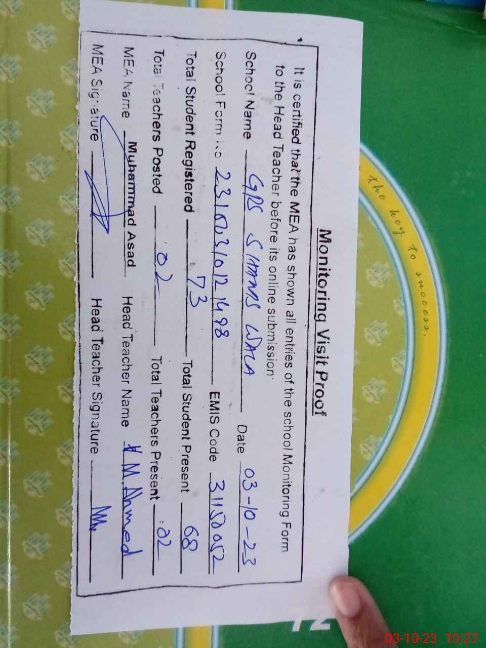 | Attendance Register | Head Teacher | MEA with School | Visit Proof |