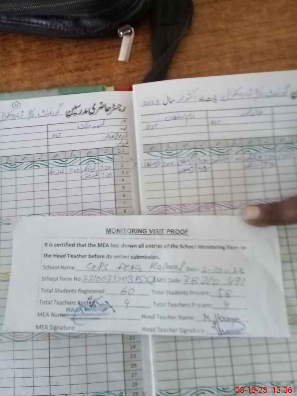 | Attendance Register | Head Teacher | MEA with School | Visit Proof |