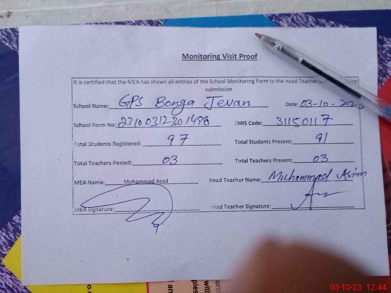 | Attendance Register | Head Teacher | MEA with School | Visit Proof |