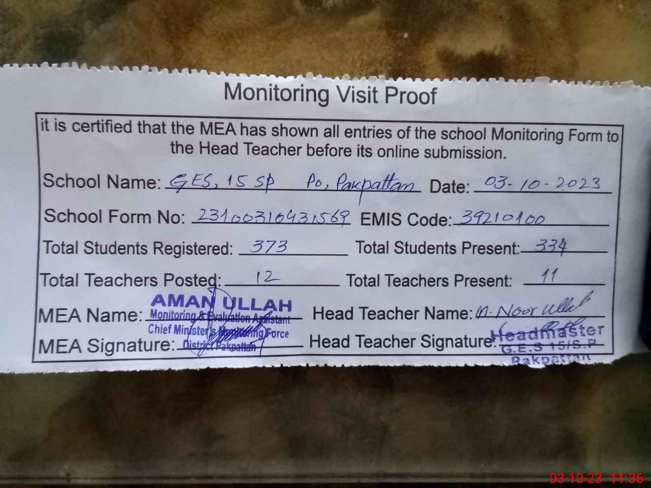 | Attendance Register | Head Teacher | MEA with School | Visit Proof |