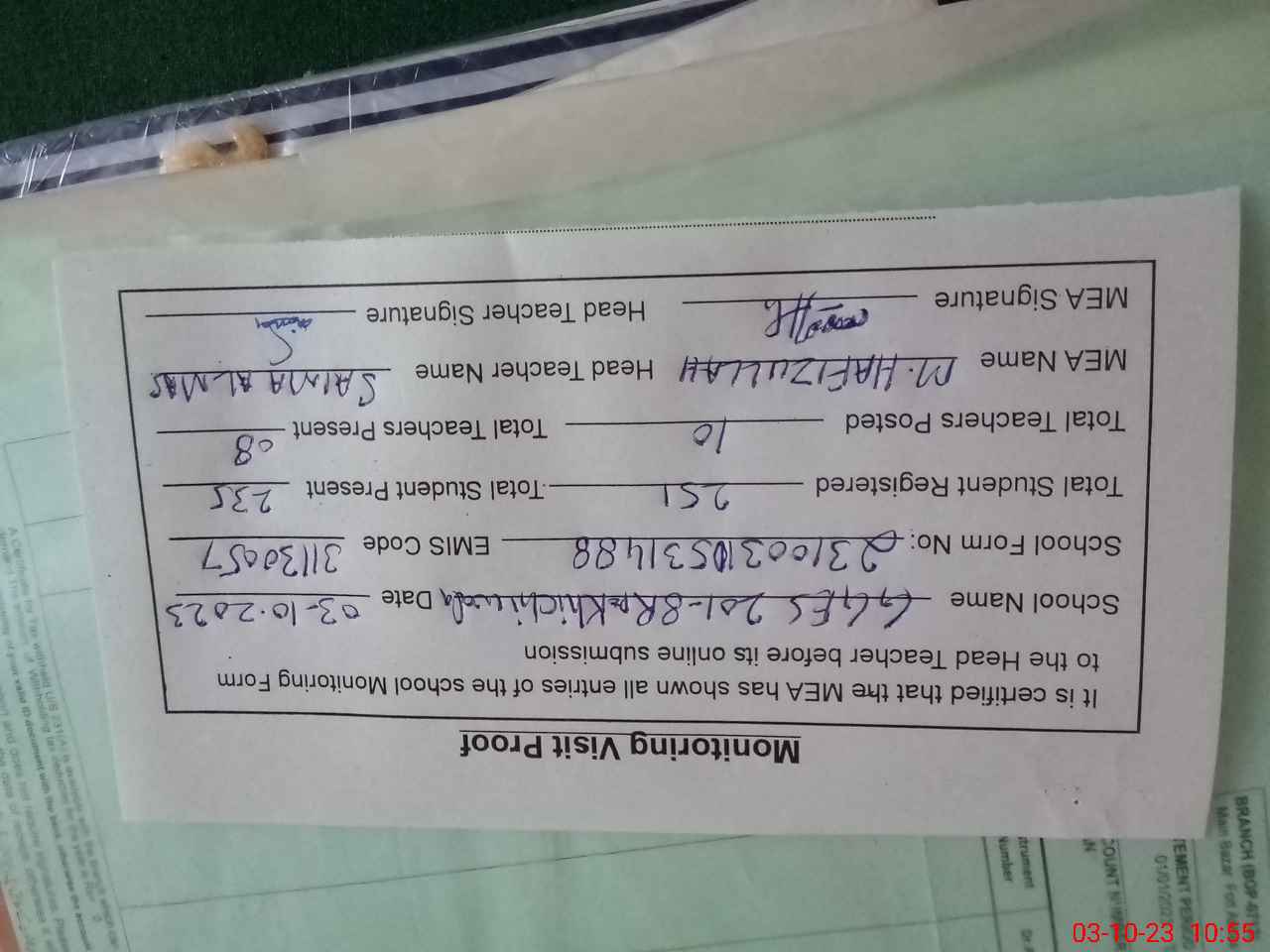 | Certified that this School was Inspected by the Undersigned MEA/DMO Today and the Information Stated Above is as Per Record. | |||||