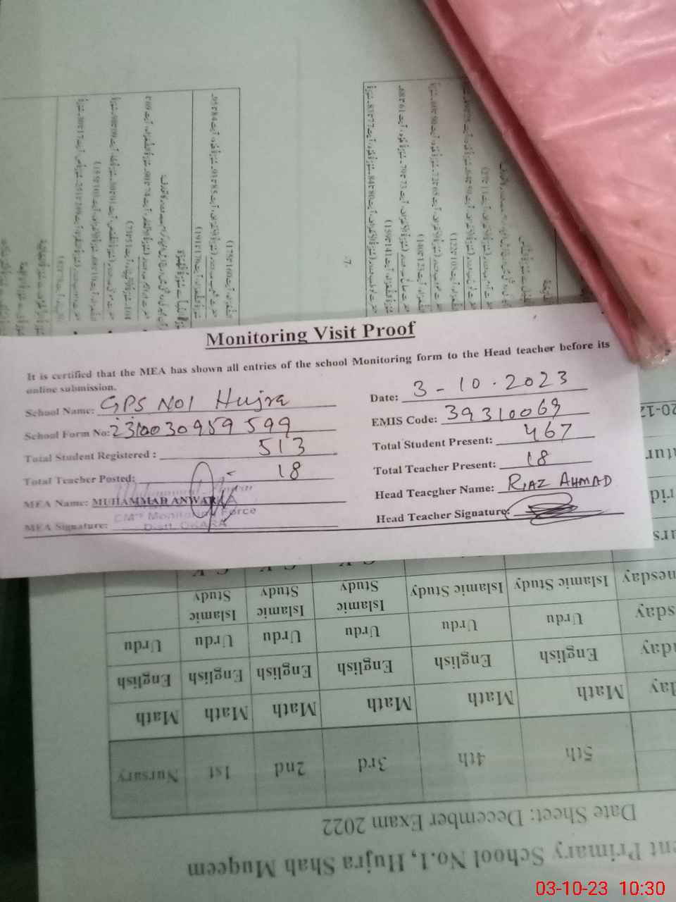 | EMIS Code: 39310069 | Name of School: GPS NO. 1 HUJRA | |||