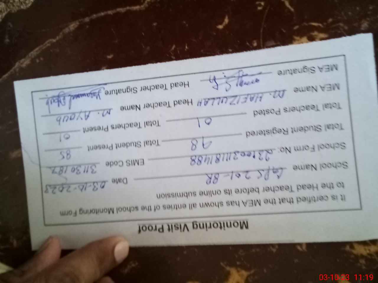 | Monitoring Date: 03-10-2023 | Start Time: 03-10-2023 11:00 AM | End Time: 03-10-2023 11:20 AM | Name of MEA: Mu**** Ha**** BN**** | |