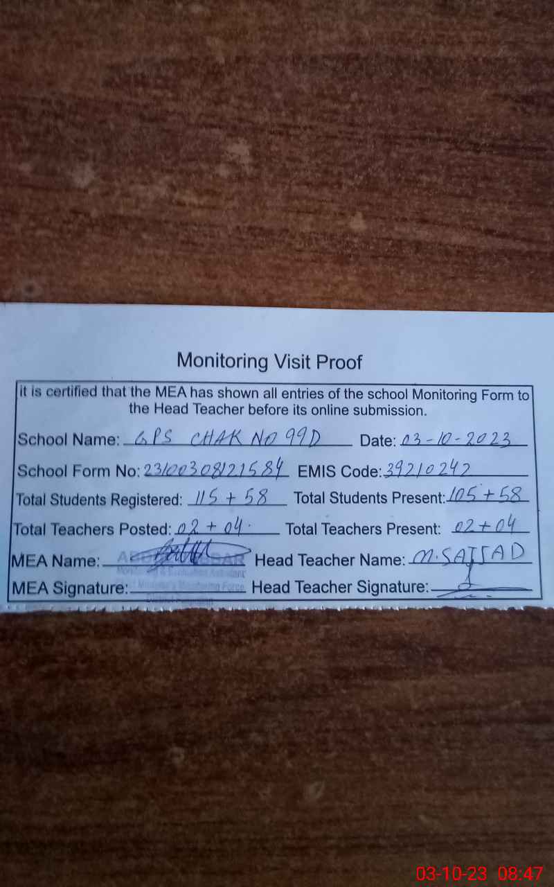 | EMIS Code: 39210242 | Name of School: GPS CHAK NO. 99 D | |||