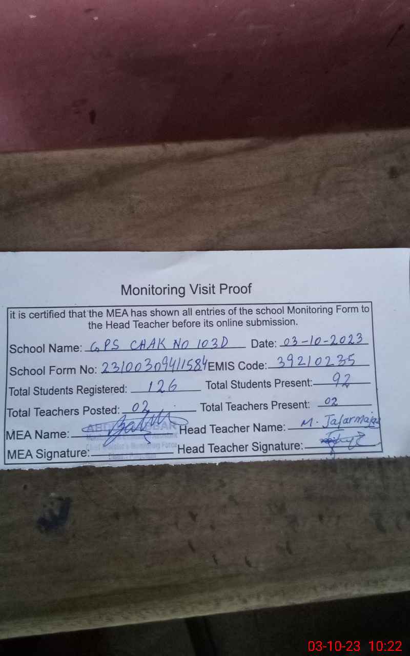 | EMIS Code: 39210235 | Name of School: GPS CHAK NO. 103 D | |||