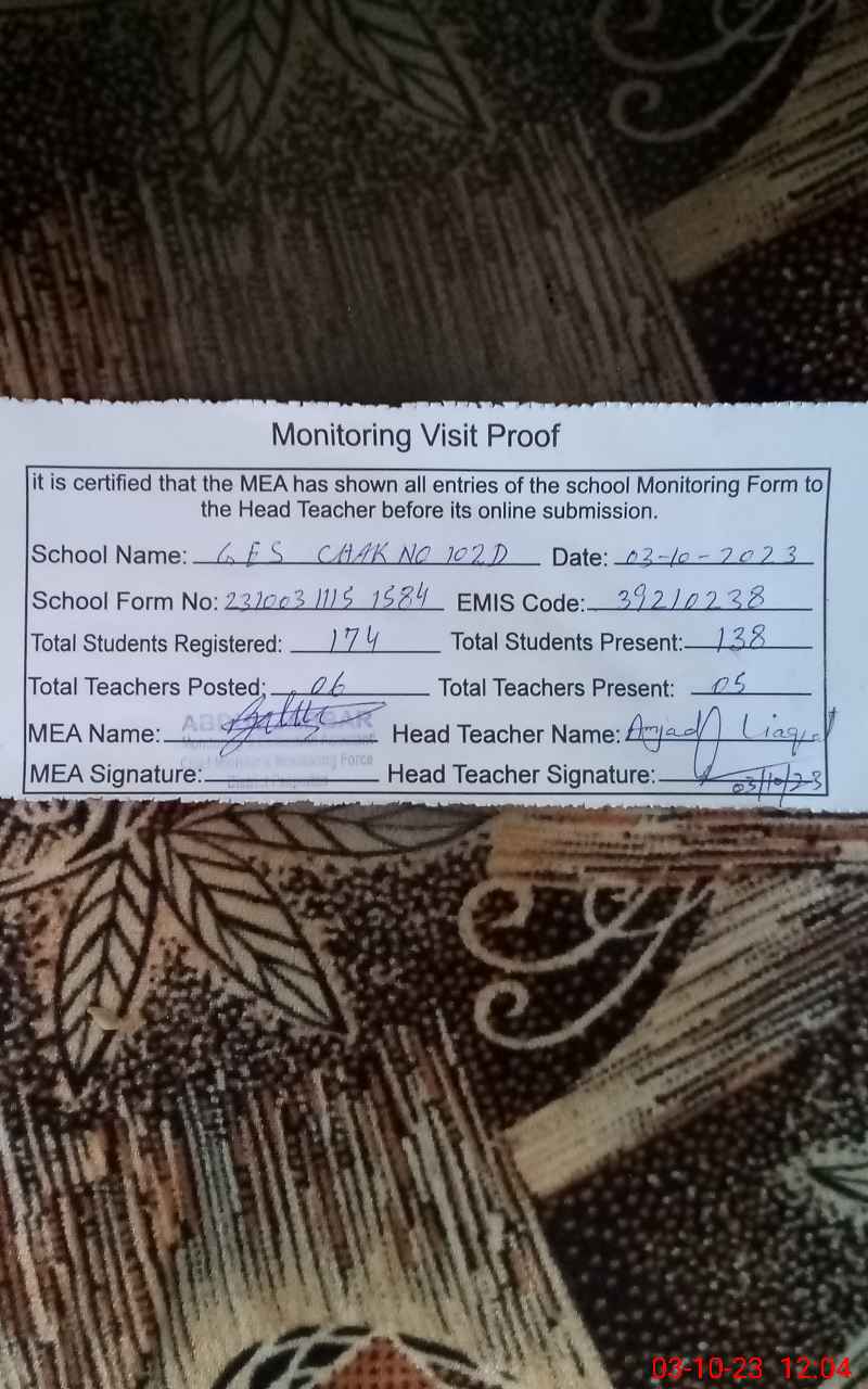 | EMIS Code: 39210238 | Name of School: GES CHAK NO. 102 /D | |||