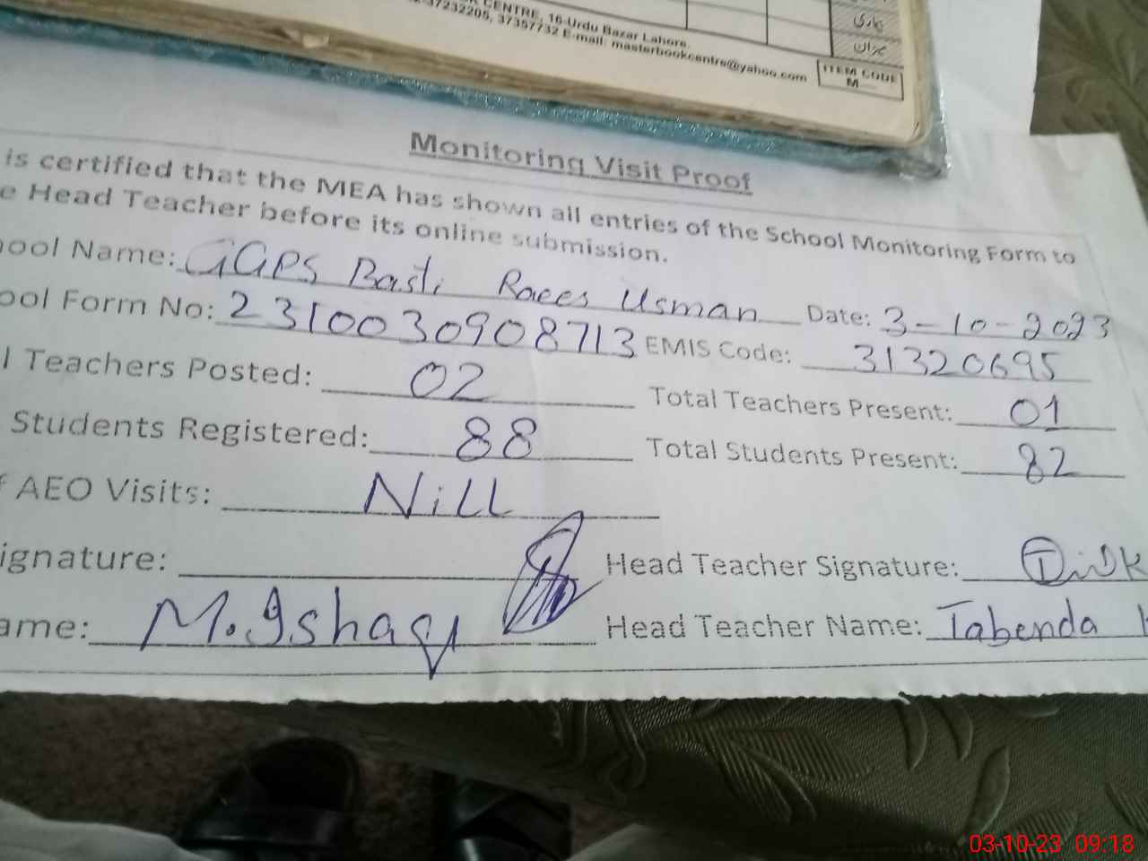 | Attendance Register | Head Teacher | MEA with School | Visit Proof |