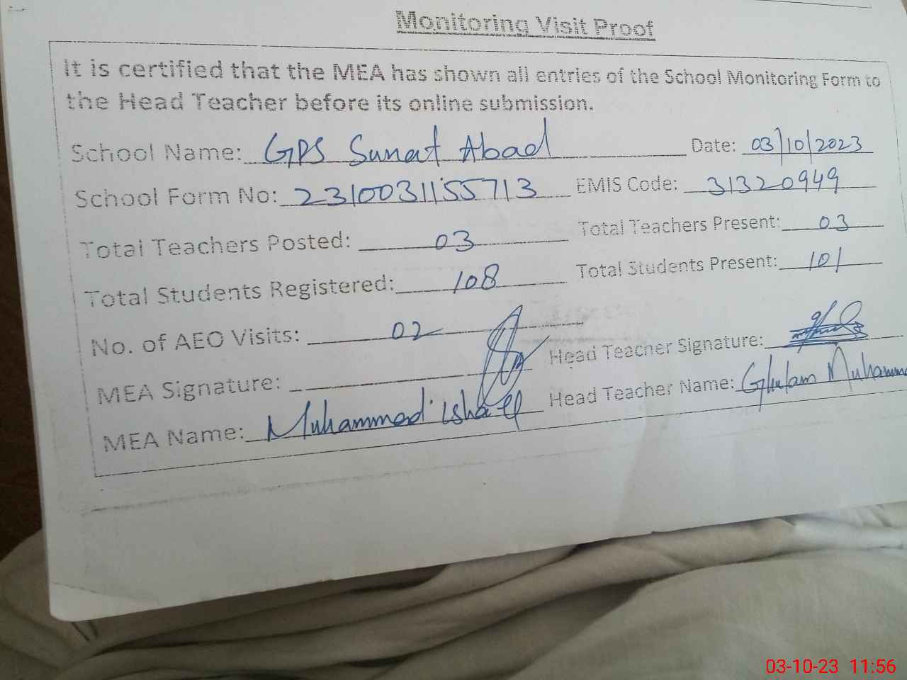 | EMIS Code: 31320949 | Name of School: GPS SUNAT ABAD | |||
