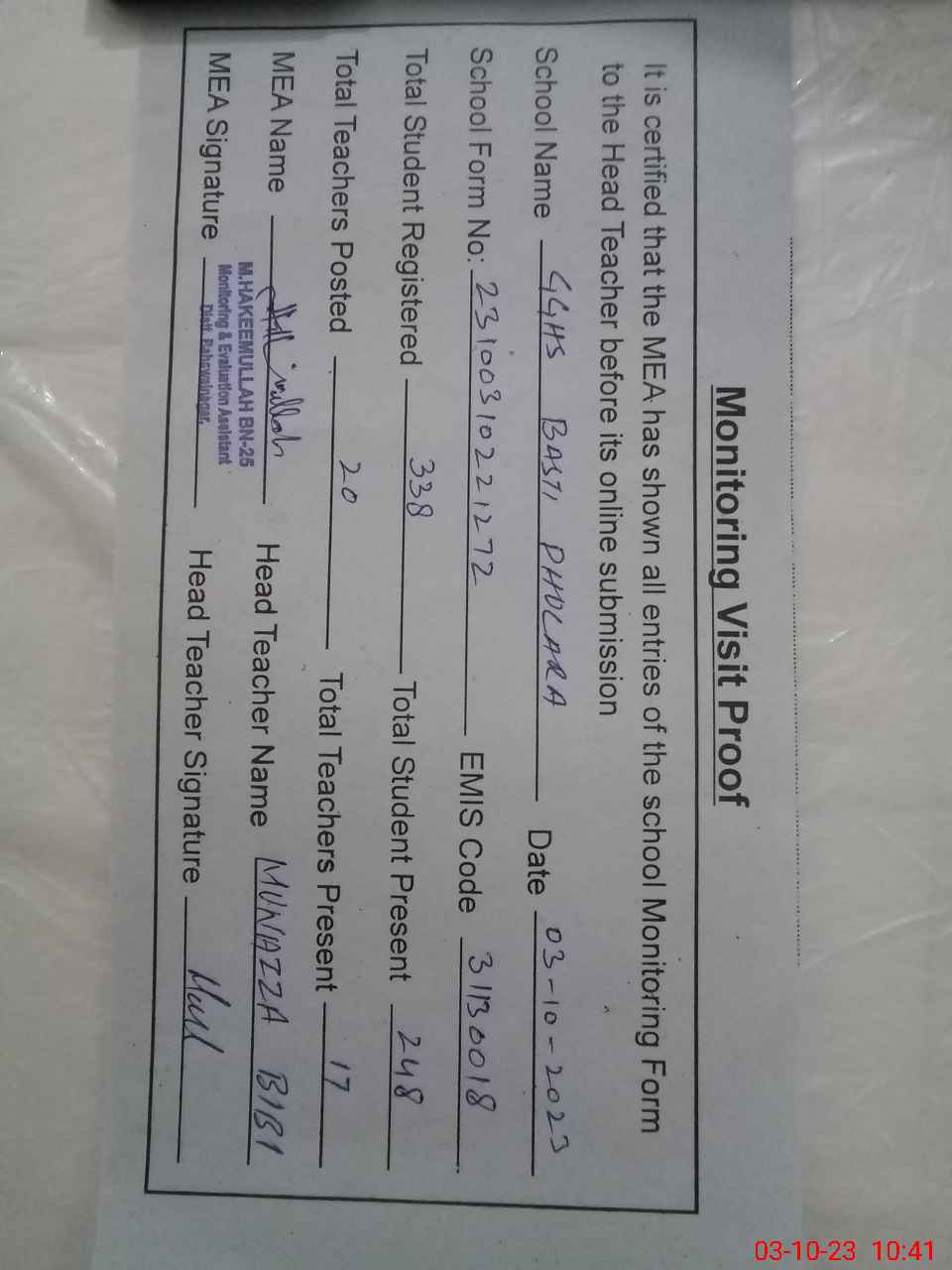 | Certified that this School was Inspected by the Undersigned MEA/DMO Today and the Information Stated Above is as Per Record. | |||||