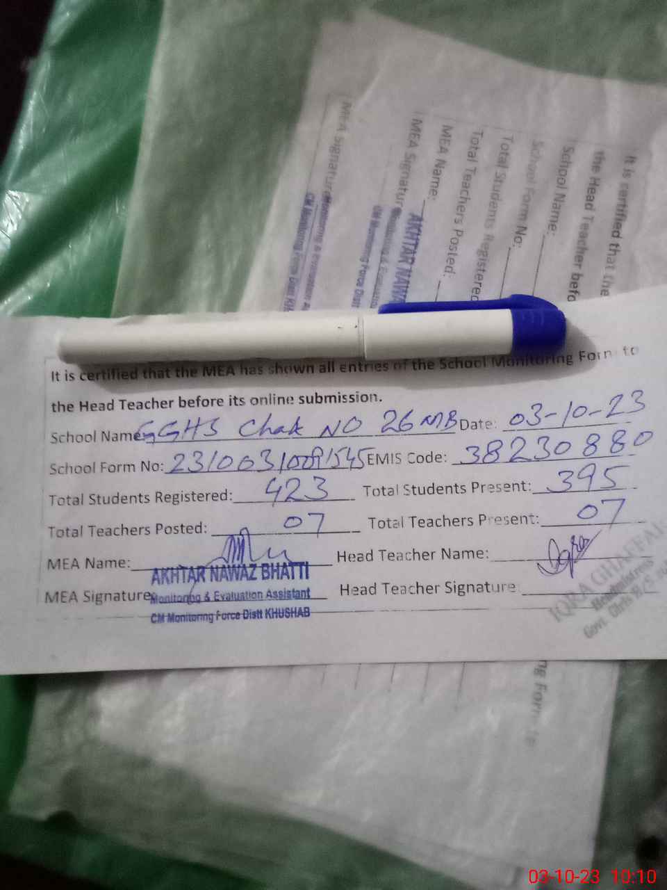 | EMIS Code: 38230880 | Name of School: GGHS CHAK NO 26 MB | |||