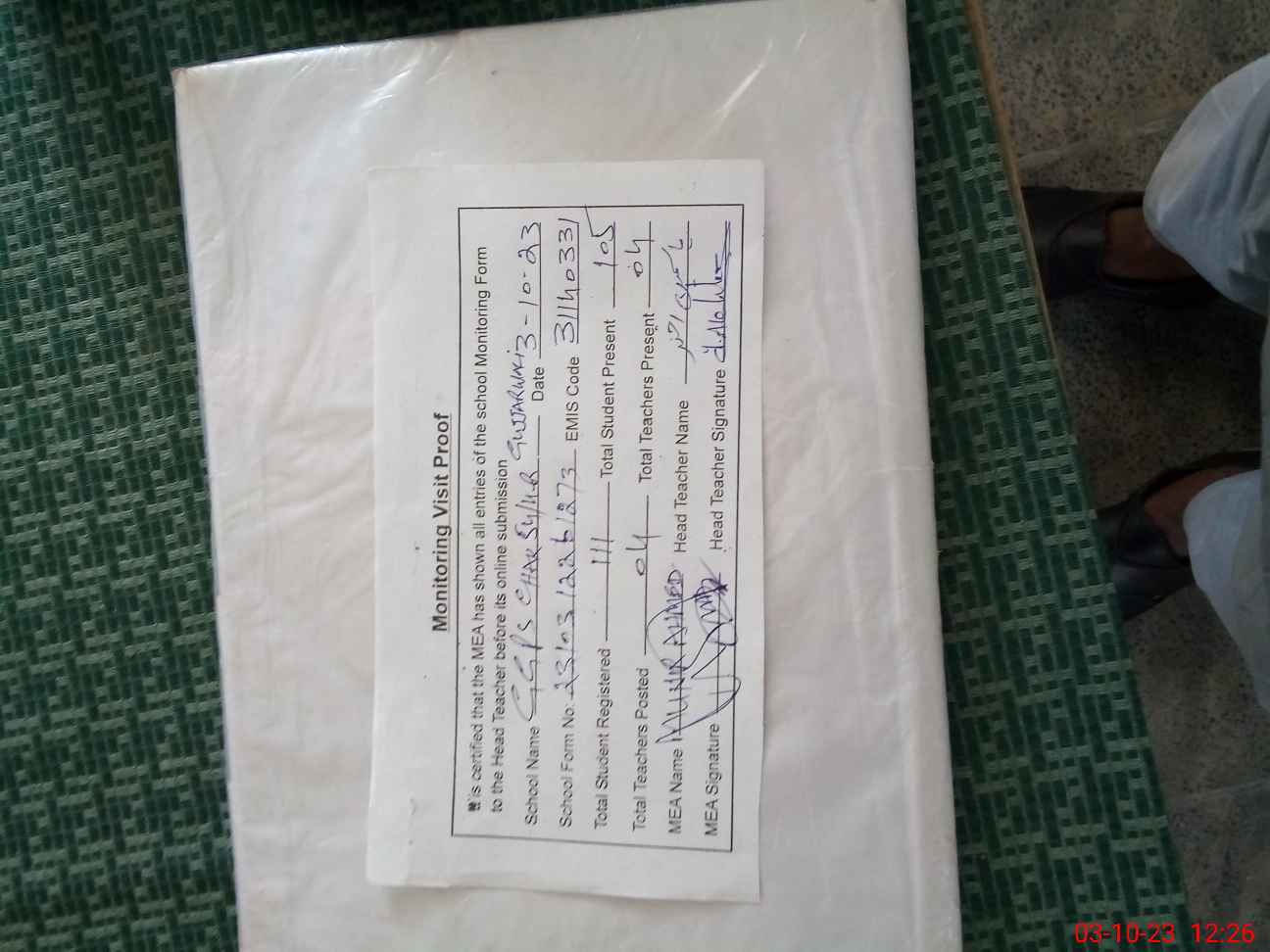 | Attendance Register | Head Teacher | MEA with School | Visit Proof |