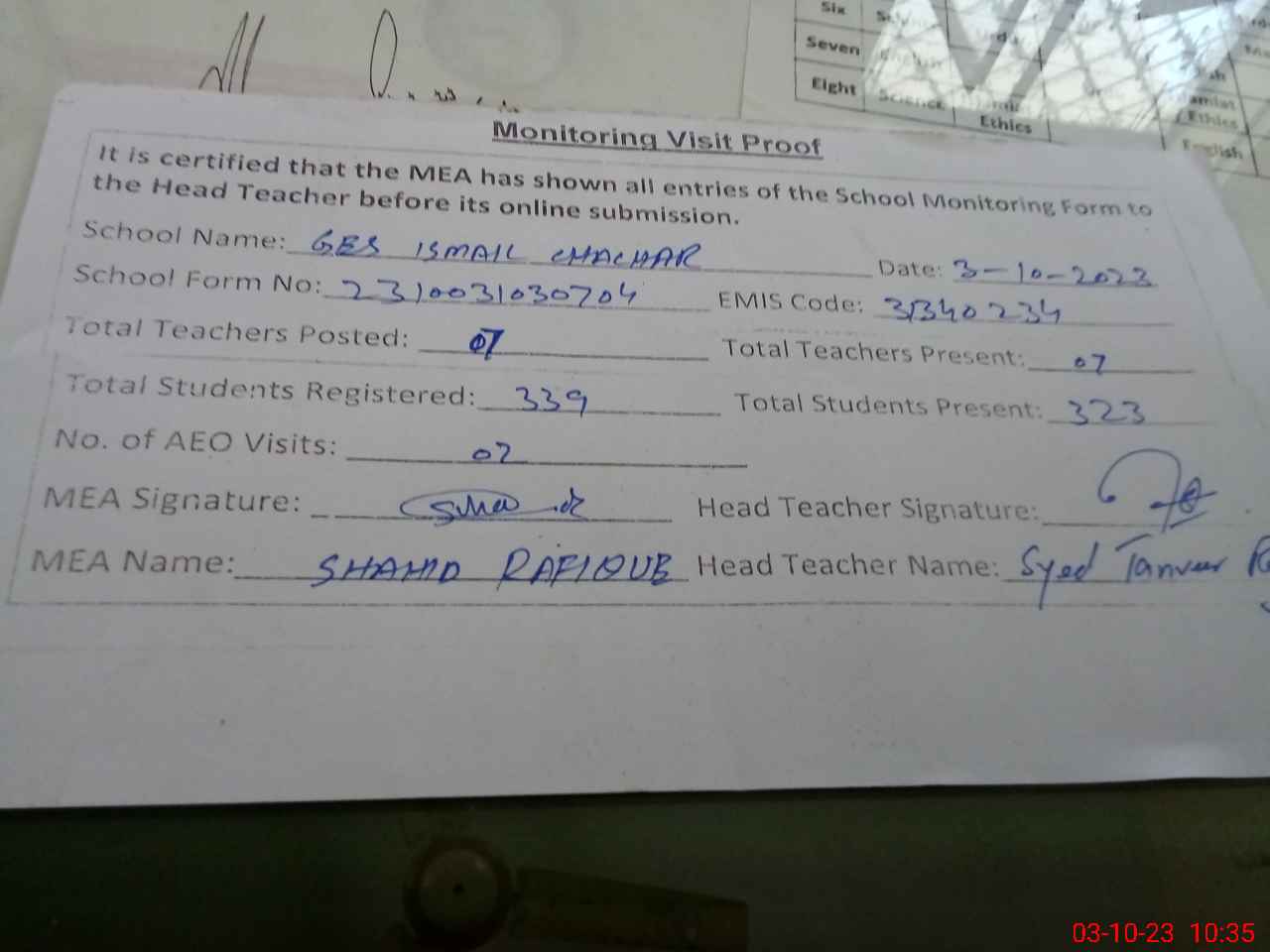 | Certified that this School was Inspected by the Undersigned MEA/DMO Today and the Information Stated Above is as Per Record. | |||||