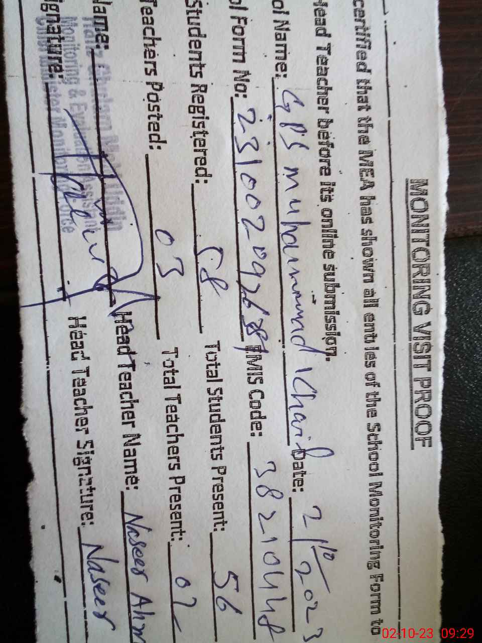 | Attendance Register | Head Teacher | MEA with School | Visit Proof |