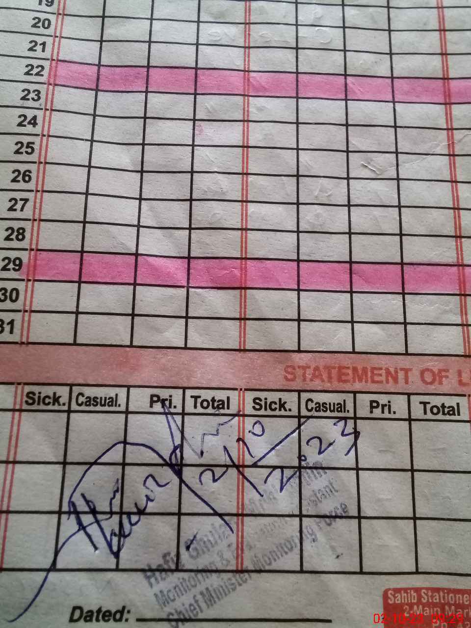 | CNIC | Full Name | Designation | R/C | Absence During Last Calender Month |