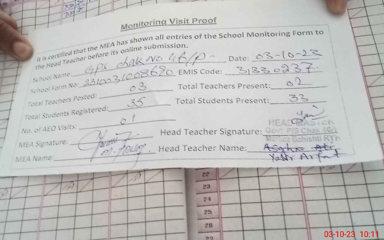 | Attendance Register | Head Teacher | MEA with School | Visit Proof |