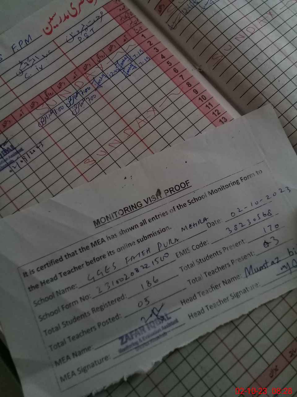 | Attendance Register | Head Teacher | MEA with School | Visit Proof |