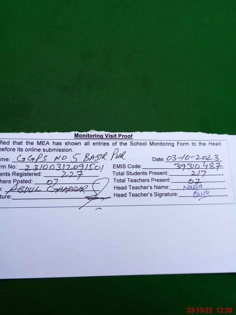 | EMIS Code: 39310487 | Name of School: GGPS NO. 5 BASIR PUR | |||
