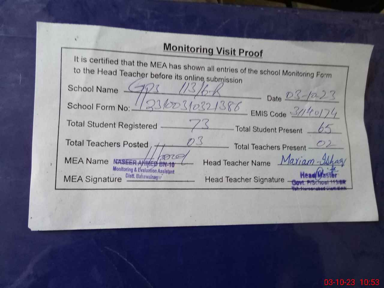| Attendance Register | Head Teacher | MEA with School | Visit Proof |