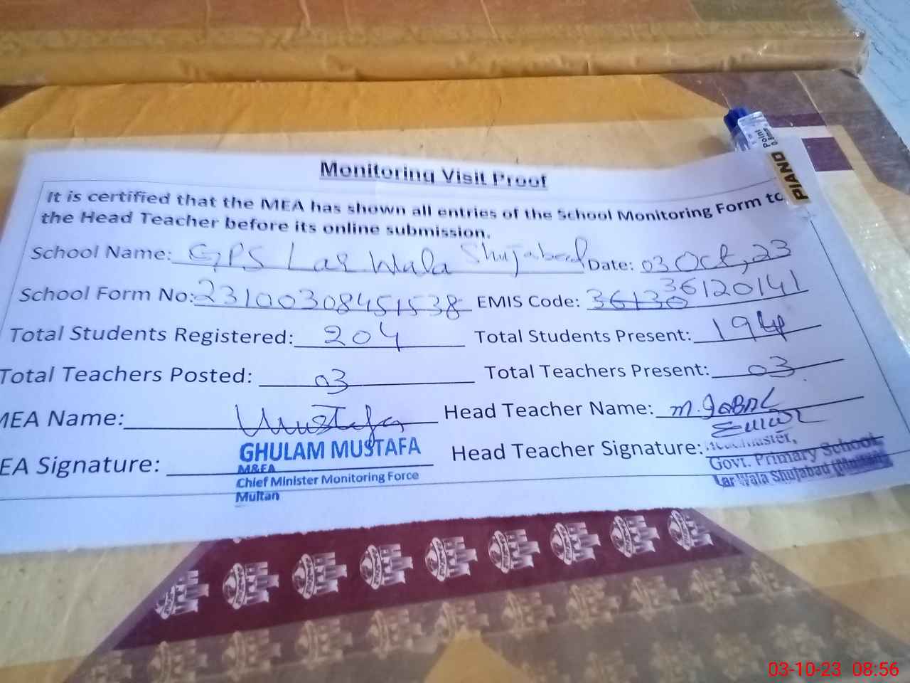 | Attendance Register | Head Teacher | MEA with School | Visit Proof |