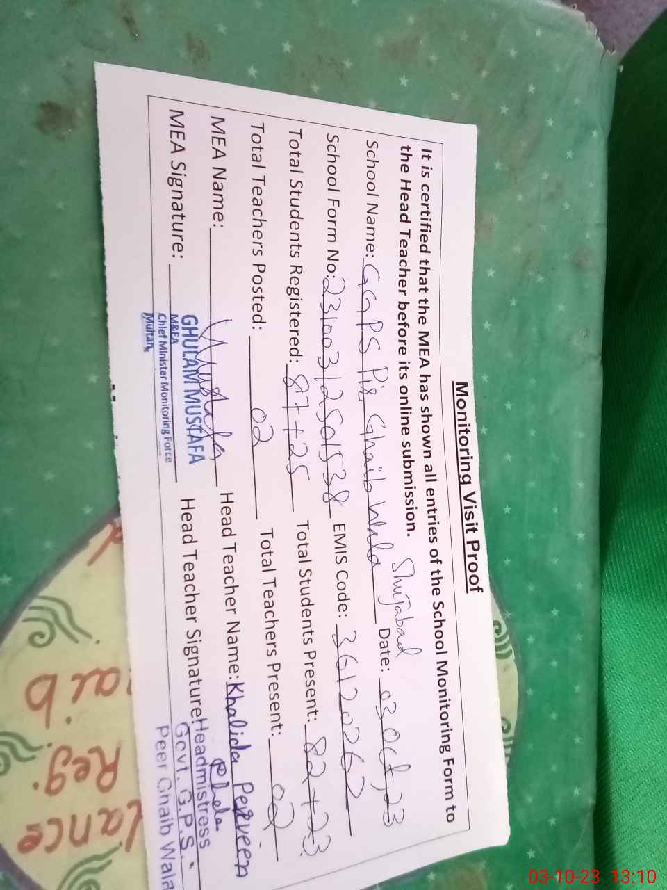 | EMIS Code: 36120262 | Name of School: GGPS PIR GAIB WALA SHUJABAD DISTT. MULTAN | |||