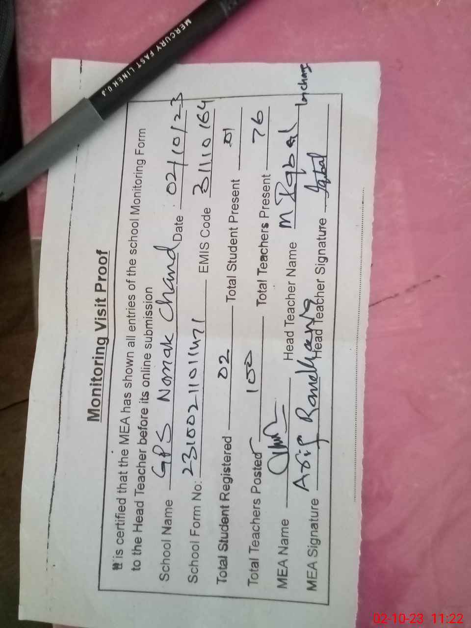 | Attendance Register | Head Teacher | MEA with School | Visit Proof |