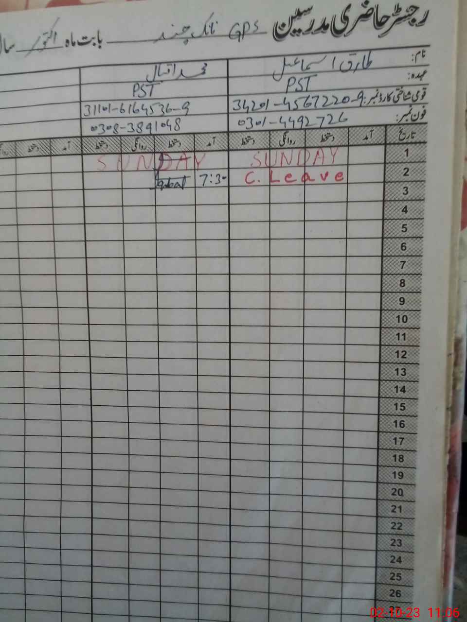 | CNIC | Full Name | Designation | R/C | Absence During Last Calender Month |
