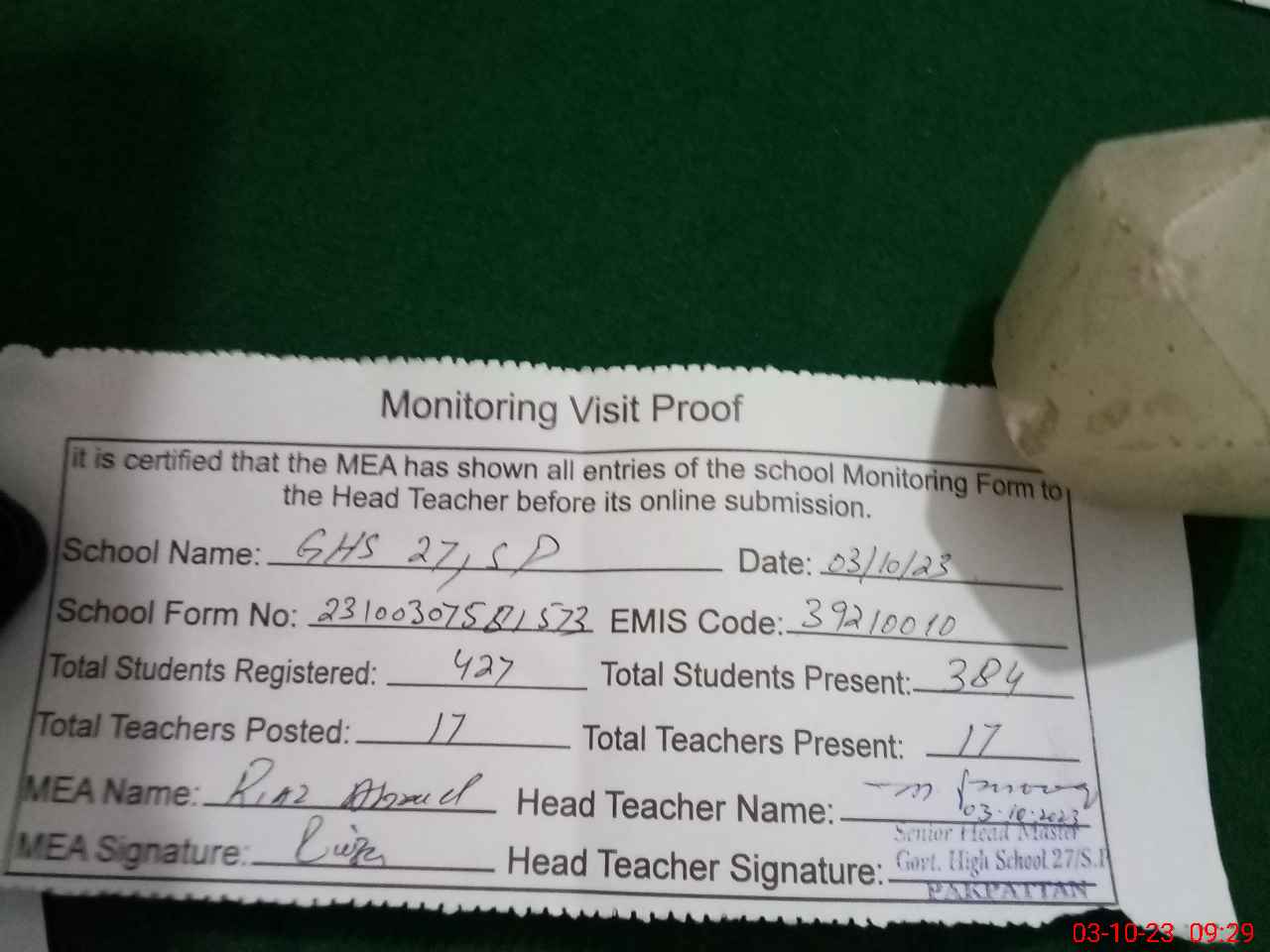 | EMIS Code: 39210010 | Name of School: GHS 27 SP | |||
