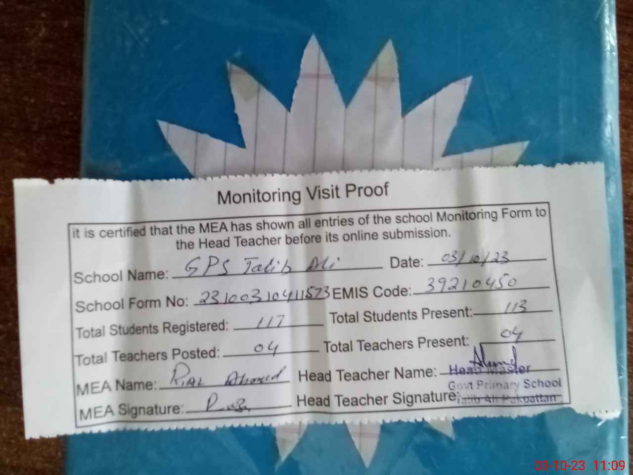 | Attendance Register | Head Teacher | MEA with School | Visit Proof |