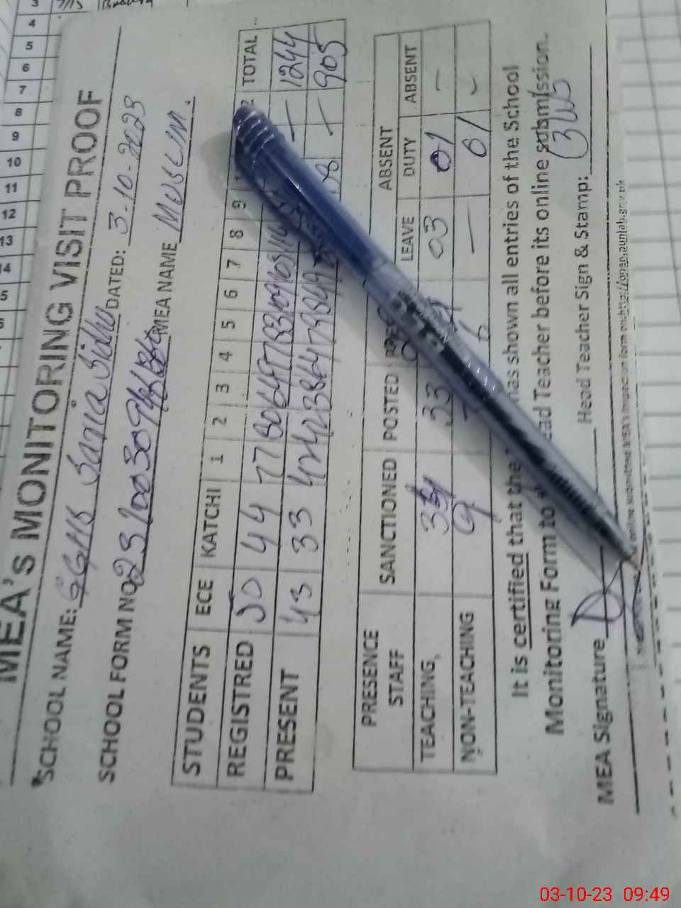 | Attendance Register | Head Teacher | MEA with School | Visit Proof |