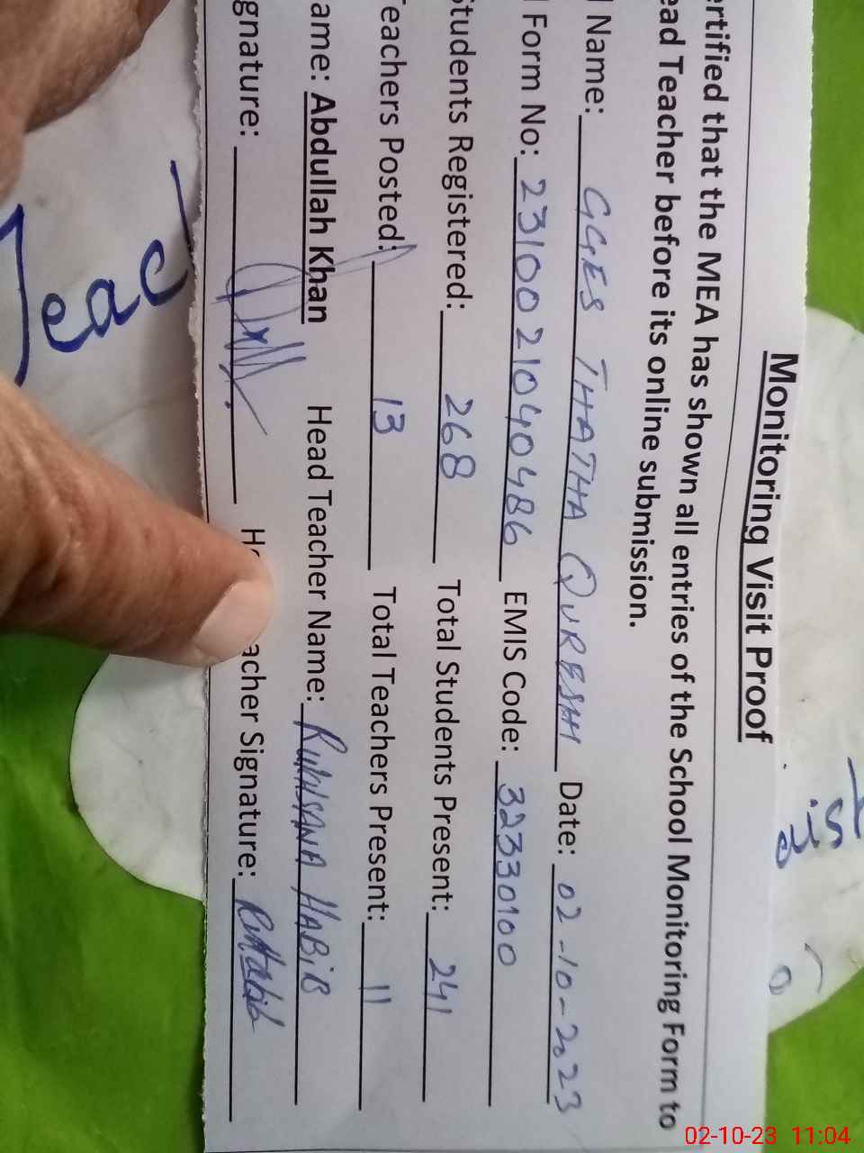 | EMIS Code: 32330100 | Name of School: GGES THATHA QURESHI | |||