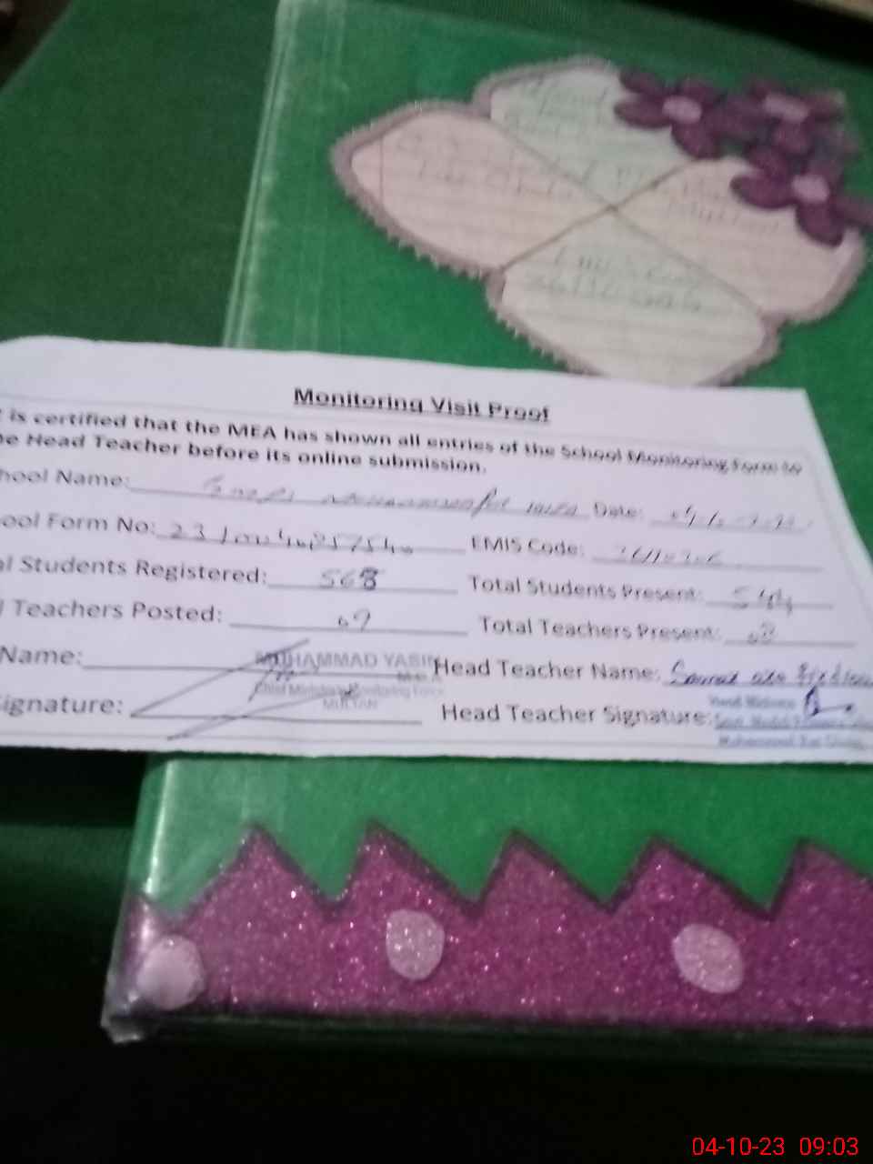 | Attendance Register | Head Teacher | MEA with School | Visit Proof |
