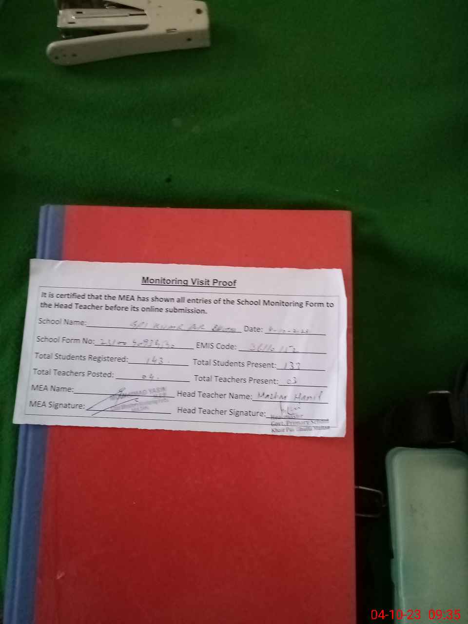 | Attendance Register | Head Teacher | MEA with School | Visit Proof |