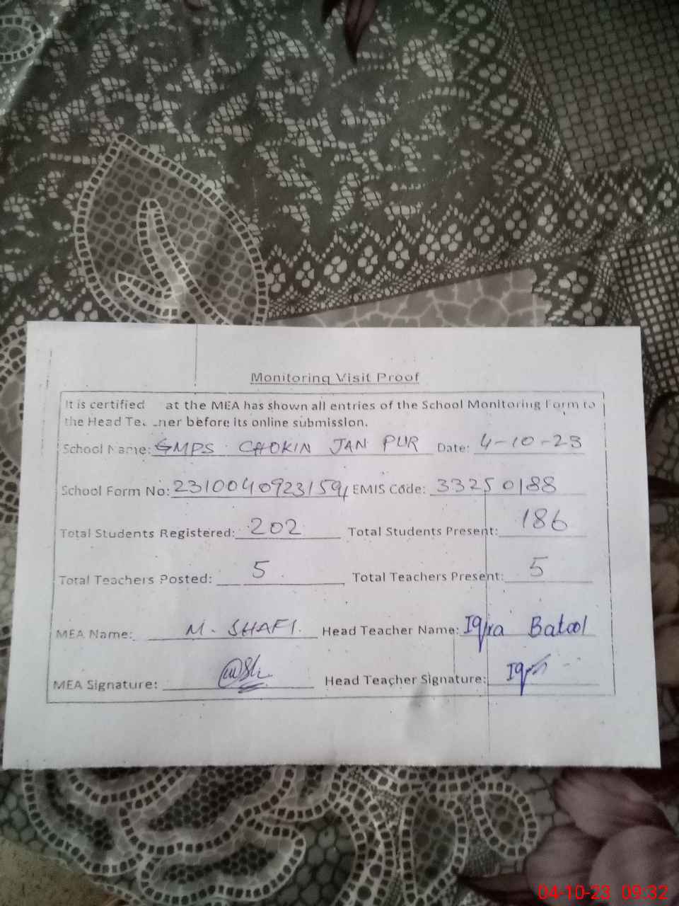 | EMIS Code: 33250188 | Name of School: GMPS CHOKIN JAN PUR | |||
