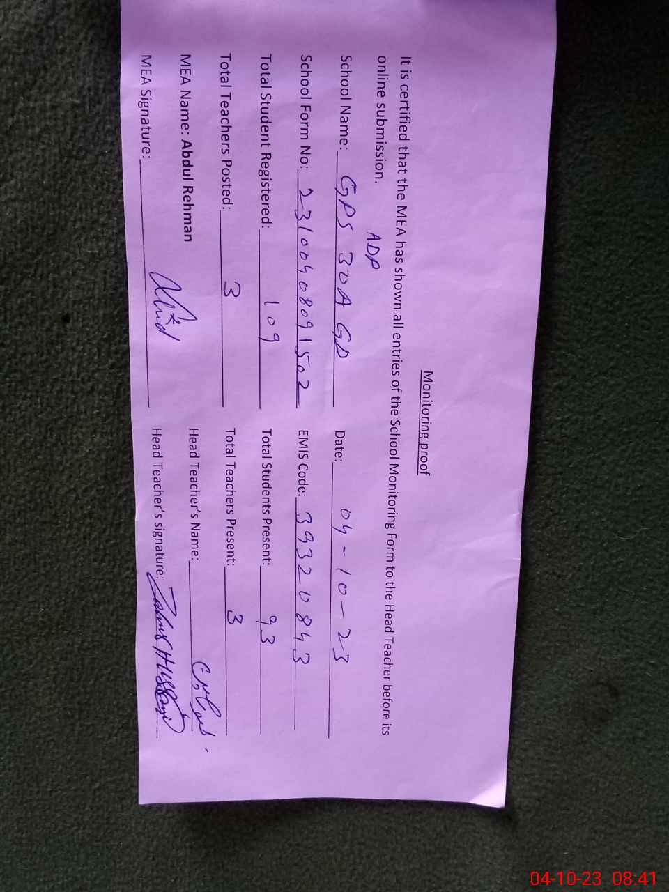| Attendance Register | Head Teacher | MEA with School | Visit Proof |
