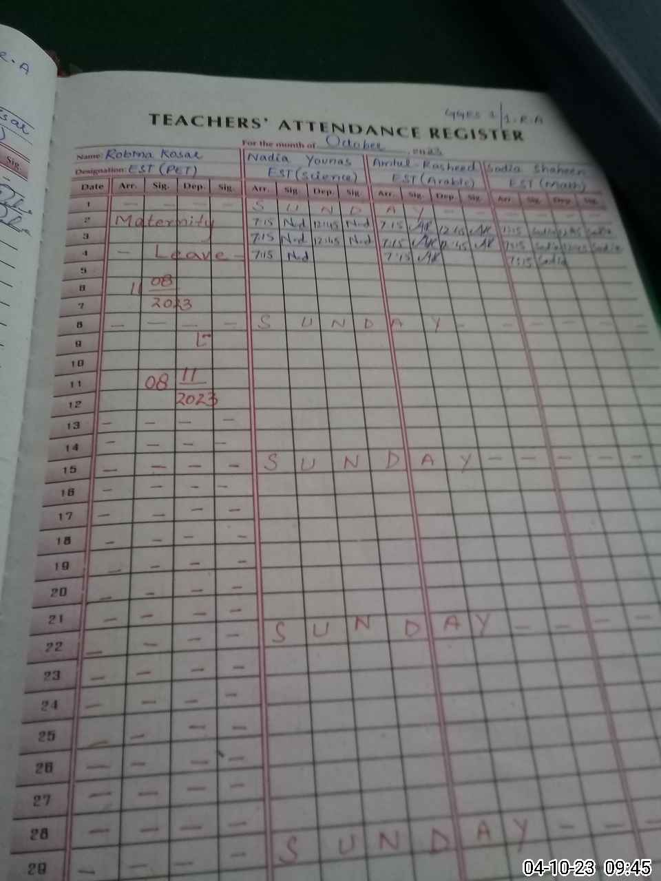 | Leave | Duty | Absent | Maternity | Medical | Ex- Pak |