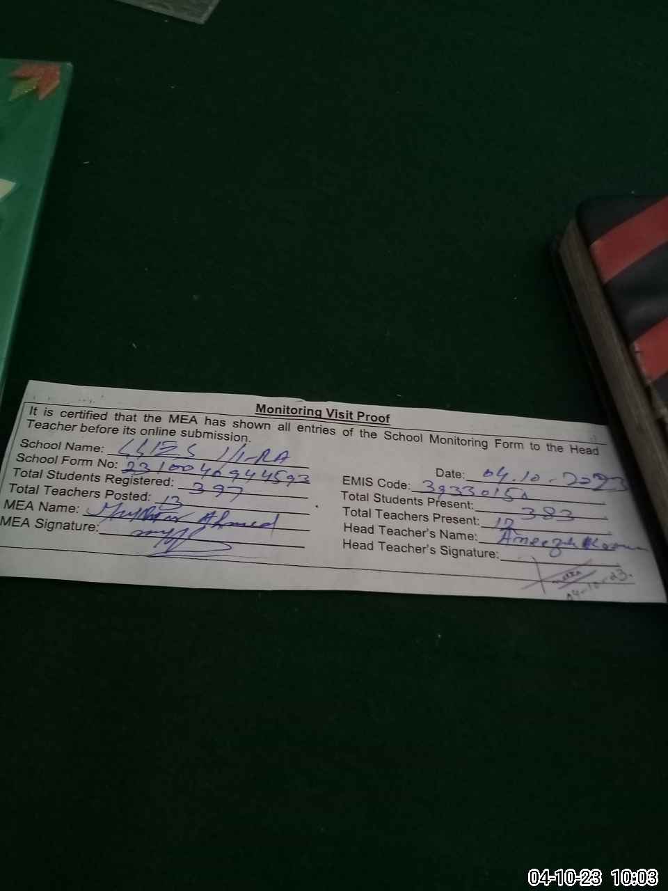 | Attendance Register | Head Teacher | MEA with School | Visit Proof |