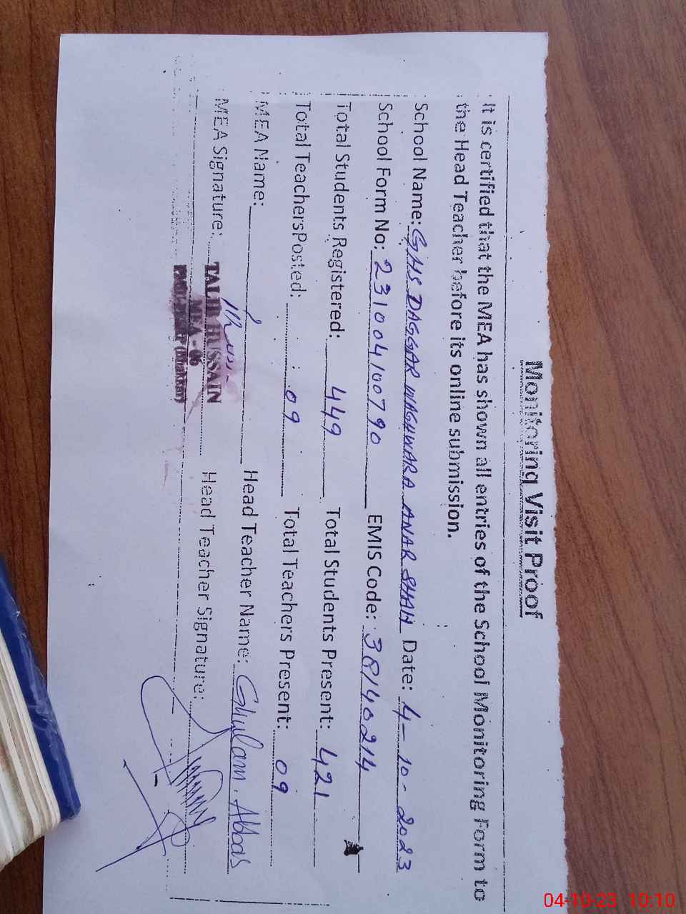 | EMIS Code: 38140214 | Name of School: GHS DAGGAR WAGWARA ANAR SHAH | |||