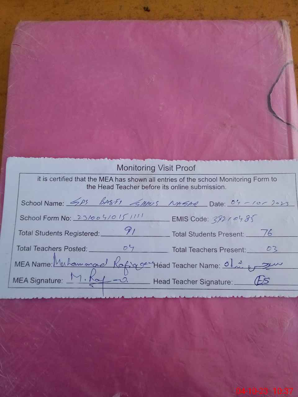 | Attendance Register | Head Teacher | MEA with School | Visit Proof |