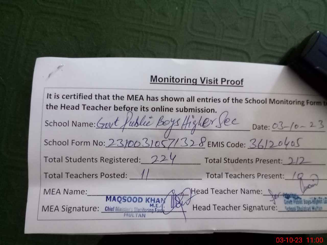 | Monitoring Date: 03-10-2023 | Start Time: 03-10-2023 10:45 AM | End Time: 03-10-2023 11:00 AM | Name of MEA: MA**** ULHA**** KH**** | |